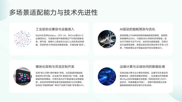 其AI驱动的能耗预测与优化功能强大,搭载LSTM神经网络构建能耗预测模型,短期预测准确率达93%,可提前48小时预判负荷峰值,还能结合天气与生产计划优化参数,商业综合体应用后节电显著,平板玻璃企业可借鉴此技术优化熔窑运行。