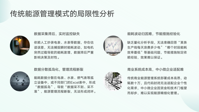 传统能源管理模式存在诸多局限性。其一,数据采集滞后且缺乏实时监控。依赖人工抄录数据,不仅有估读误差,还无法捕捉瞬时能耗波动,像电机突然过载导致的能耗激增就难以察觉,严重影响决策及时性。其二,能耗波动归因困难,节能措施经验化。缺乏量化分析手段,无法精准定位能耗问题,节能措施多凭经验,效果难以保证。其三,数据分散孤岛化,管理流程断裂。能耗数据分散在孤立设备或不同部门的Excel表中,形成"数据孤岛",导致数据采集困难且不准确,能源管理无法形成闭环。其四,商业系统成本高,中小微企业适配难。传统商业能源管理系统部署成本高昂,代码封闭又无法满足企业个性化需求,使中小微企业难以实现能源精细化管理。