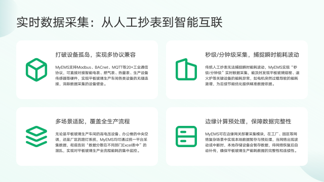 MyEMS的实时数据采集功能实现了从人工抄表到智能互联的跨越。一方面,它支持20+工业通信协议,能直接对接各类硬件,打破设备孤岛,实现平板玻璃生产车间设备的无缝连接,消除数据采集的设备壁垒。