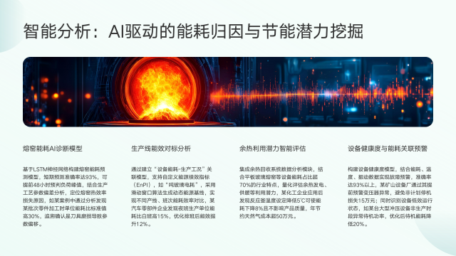 其次,通过多维度能效对标识别低效设备,横向对比同类型设备、纵向分析历史能耗趋势,快速定位问题,如某企业发现2号退火窑问题并修复后节电显著。