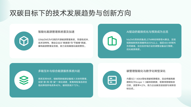 双碳目标推动下,能源管理领域呈现四大技术发展趋势与创新方向。其一,智能化能源管理系统普及加速,以MyEMS为代表的开源系统,凭借低成本、高灵活特性,助力企业实现精细化能效管控,从"数据盲"转变为"节能精"。其二,AI驱动的能效优化与预测成为主流,MyEMS集成LSTM神经网络等算法,能提前48小时预判负荷峰值,结合实时电价优化能源调度,短期能耗预测准确率超93%。其三,多能互补与综合能源服务系统兴起,支持新能源设备接入与协同管理,实现"源 - 网 - 荷 - 储"一体化调度,显著降低供电成本与碳排放。其四,碳管理智能化与数字化转型深化,内置标准碳核算模块,缩短核算周期,降低误差率,助力企业追踪碳足迹与达成减排目标。