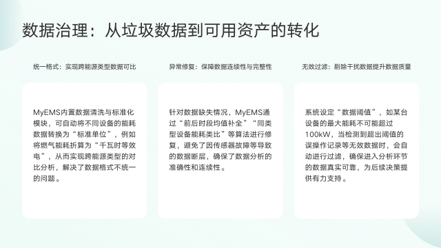MyEMS的数据治理功能,可将垃圾数据转化为可用资产,主要体现在统一格式、异常修复和无效过滤三个方面。统一格式时,MyEMS内置相关模块,能自动把不同设备的能耗数据转换为"标准单位",如将燃气能耗折算成"千瓦时等效电",实现跨能源类型对比分析,解决数据格式不统一问题。