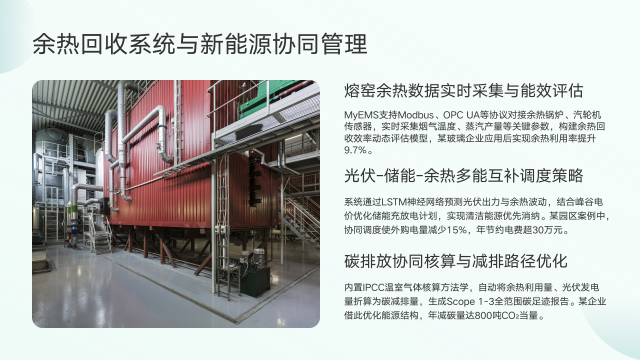 MyEMS在余热回收系统与新能源协同管理方面展现出显著优势。它支持Modbus、OPC UA等协议,能对接余热锅炉、汽轮机传感器,实时采集关键参数,构建余热回收效率动态评估模型,助力某玻璃企业将余热利用率提升9.7%,实现了余热资源的高效利用。