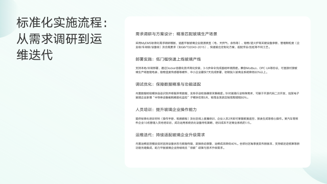 MyEMS在平板玻璃企业的标准化实施流程,涵盖从需求调研到运维迭代的多个环节。需求调研与方案设计阶段,采用标准化模板,全面涵盖能源类型、设备参数、管理颗粒度及合规要求,能快速输出适配不同工艺的定制化方案。