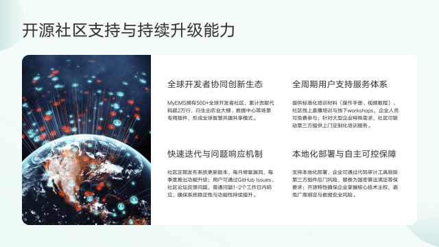 此外,依托全球开发者社区,MyEMS能快速迭代功能,集成新兴模块,帮助企业响应"双碳"政策与新能源应用趋势,避免系统过时风险。