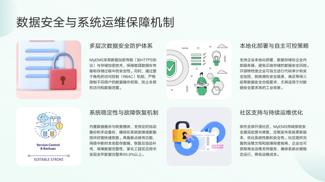 MyEMS具备完善的数据安全与系统运维保障机制。多层次数据安全防护体系采用数据加密传输与存储加密技术,保障能源数据传输和存储安全,同时通过基于角色的访问控制机制,严格限制用户操作权限,防止非授权访问和数据泄露。