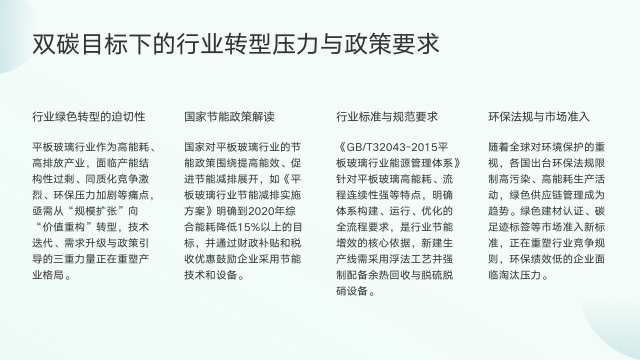 在双碳目标背景下,平板玻璃行业面临着巨大的转型压力与政策要求。该行业作为高能耗、高排放产业,产能结构性过剩、同质化竞争激烈、环保压力加剧等痛点凸显,从"规模扩张"向"价值重构"转型迫在眉睫,技术、需求与政策三重力量正重塑产业格局。