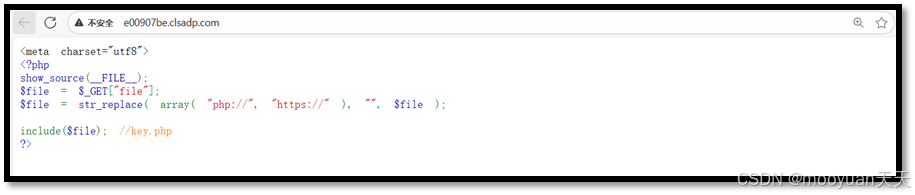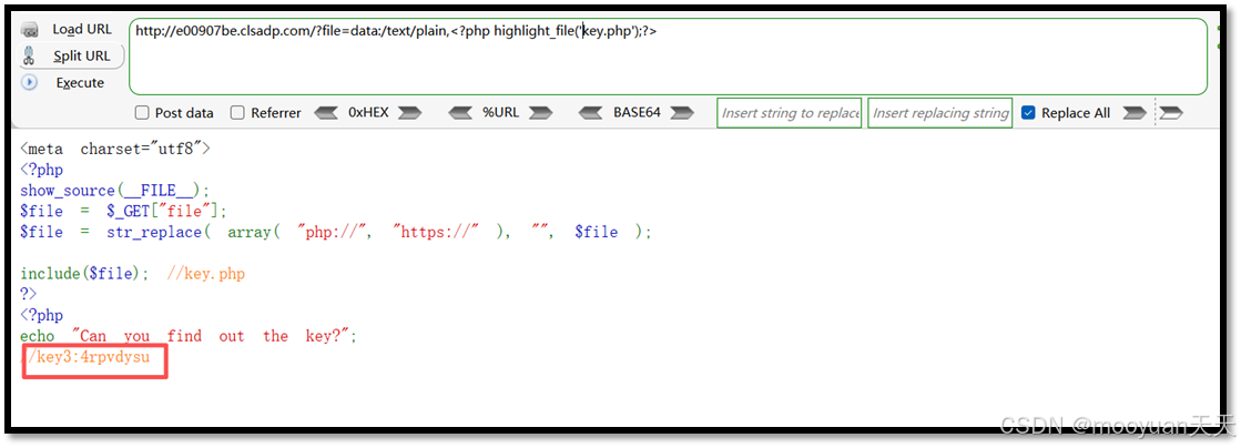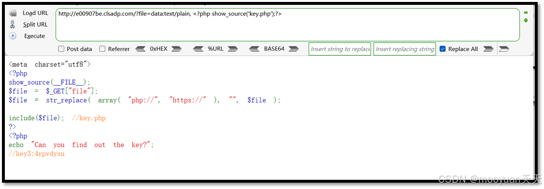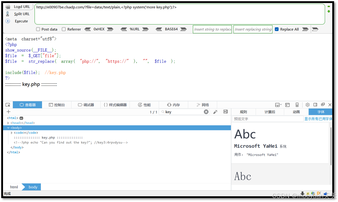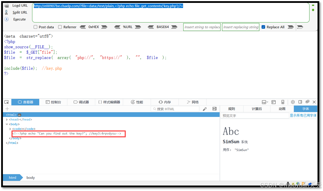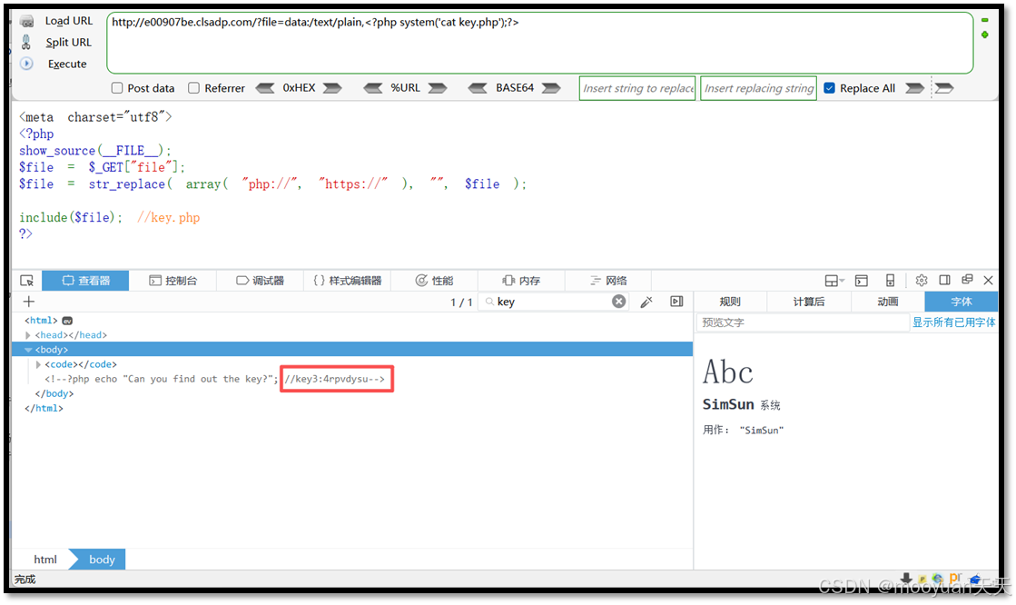 构造payload查看key,如下所示Data协议Payload通过PHP的system函数直接执行系统命令cat key.php来读取当前目录下key.php文件的原始内容,其中data:/text/plain,是使用单斜杠变异的协议格式(可能用于绕过安全检测),而<?php system('cat key.php');?>是实际执行的恶意代码,该指令会在服务器操作系统层面直接输出key.php文件的完整代码内容