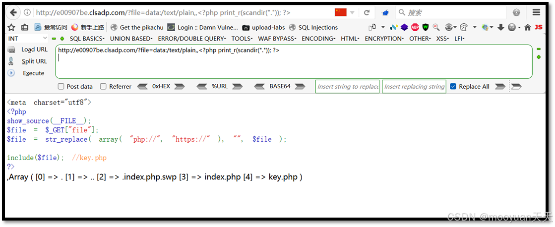 构造payload查看当前目录下文件,如下所示这段Data协议Payload通过PHP的scandir(".")函数列出来当前目录下的所有文件和文件夹,其中data:/text/plain,是经过变异的协议标识符(使用单斜杠可能用于绕过某些安全过滤),而<?php print_r(scandir(".")); ?>是实际执行的PHP代码,其功能是扫描并打印Web应用程序当前工作目录的完整文件列表