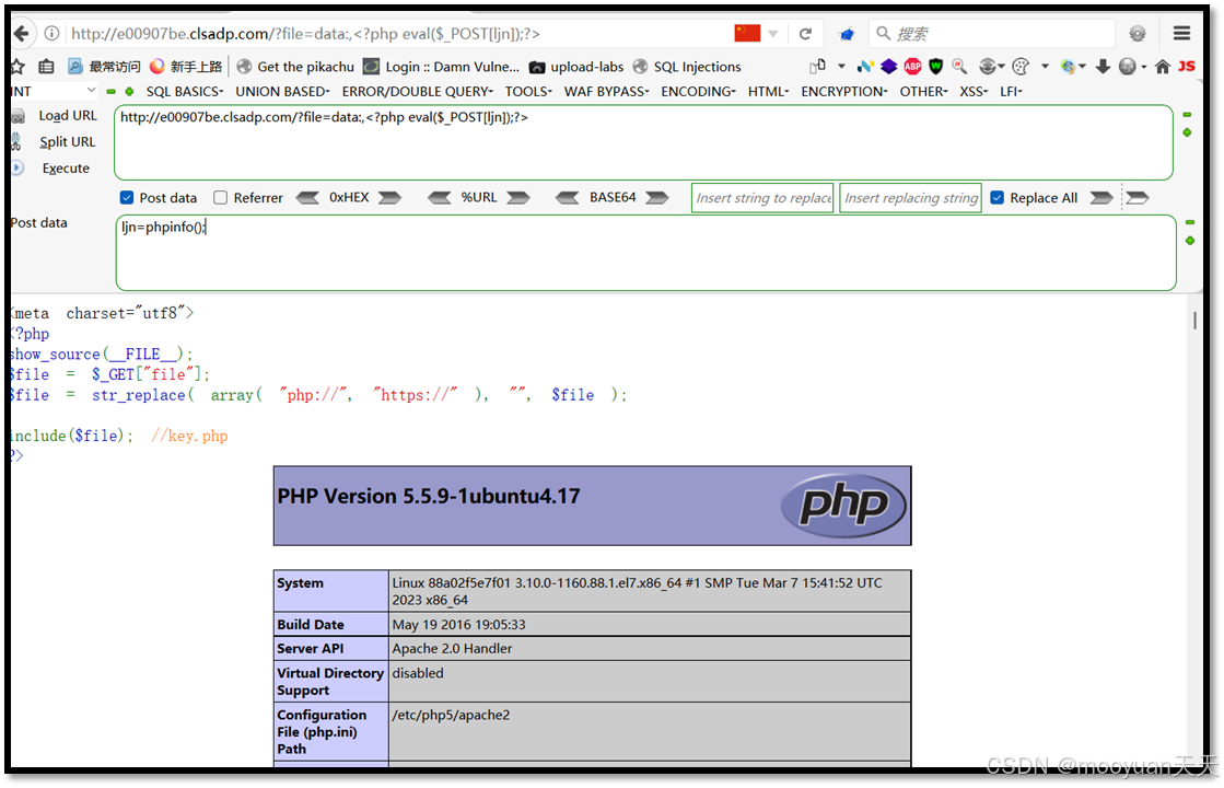 hackbar连接木马,如下所示执行phpinfo函数成功,说明木马有效。