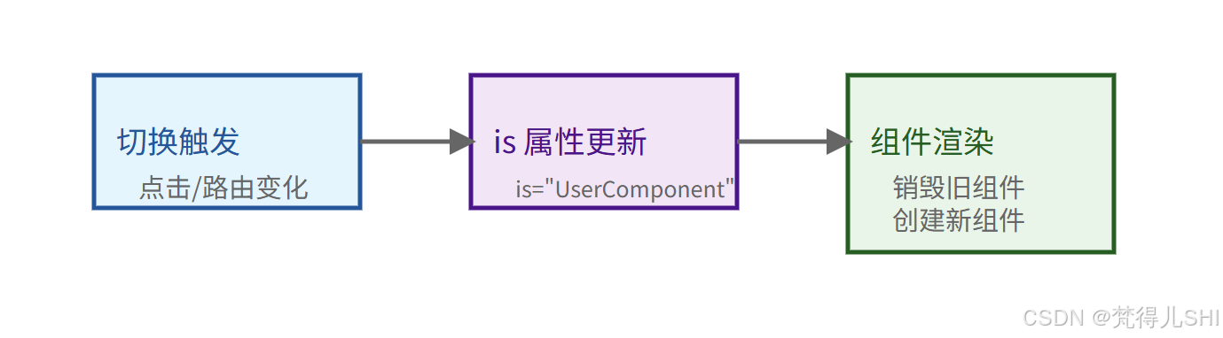 is属性的值 :可以是组件的注册名称 (字符串),也可以是组件的选项对象 (比如直接传入UserComponent)。- 组件通信 :动态组件的传参和事件监听,和普通组件完全一致,通过