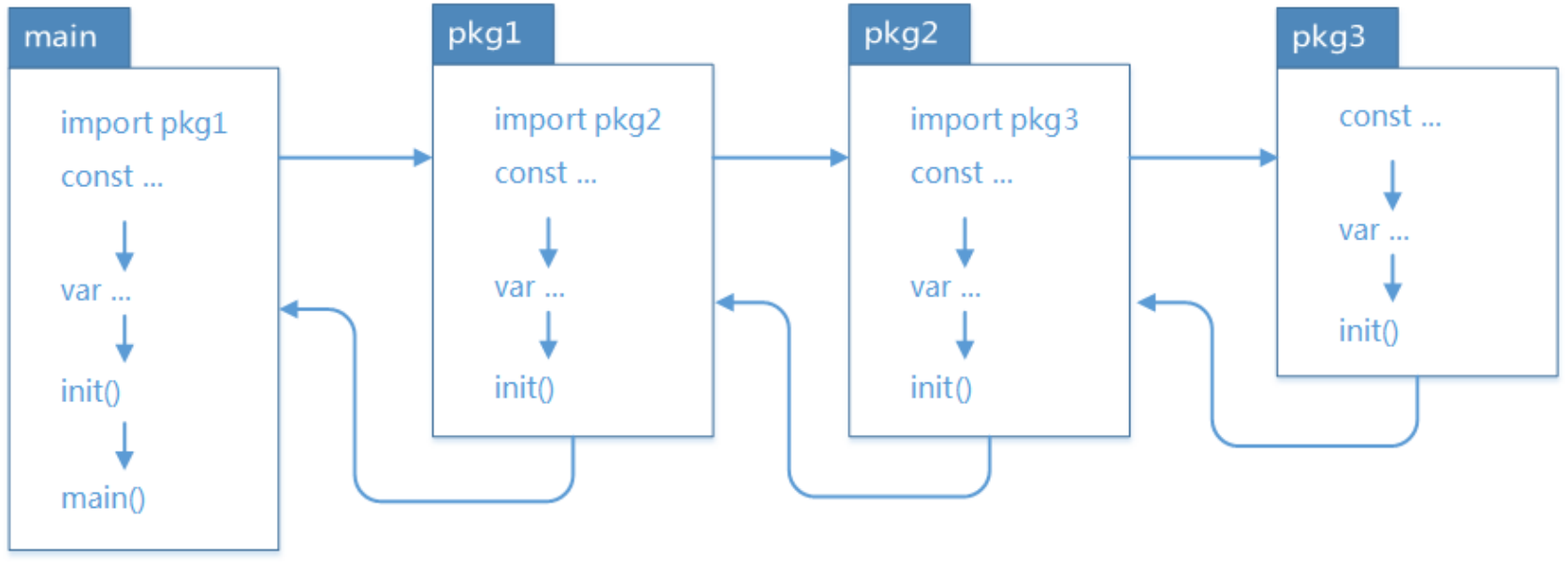 实验与结论相符合,按照导入包的层次,最先被依赖的包最先被初始化,且初始化的顺序是先初始化包变量,再初始化 init 函数。初始化过程总结如下: