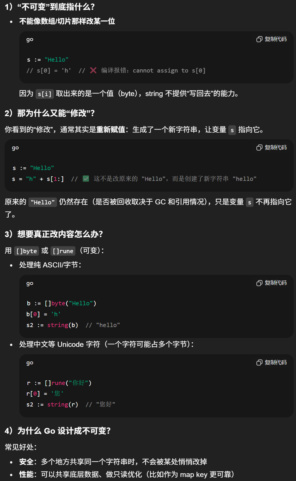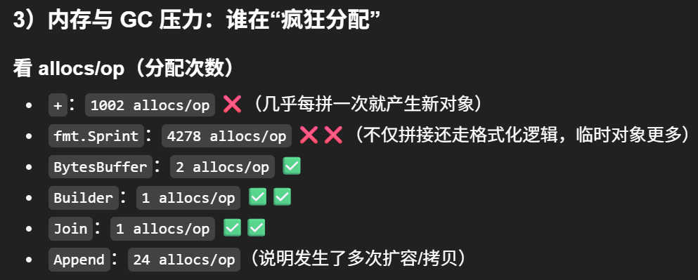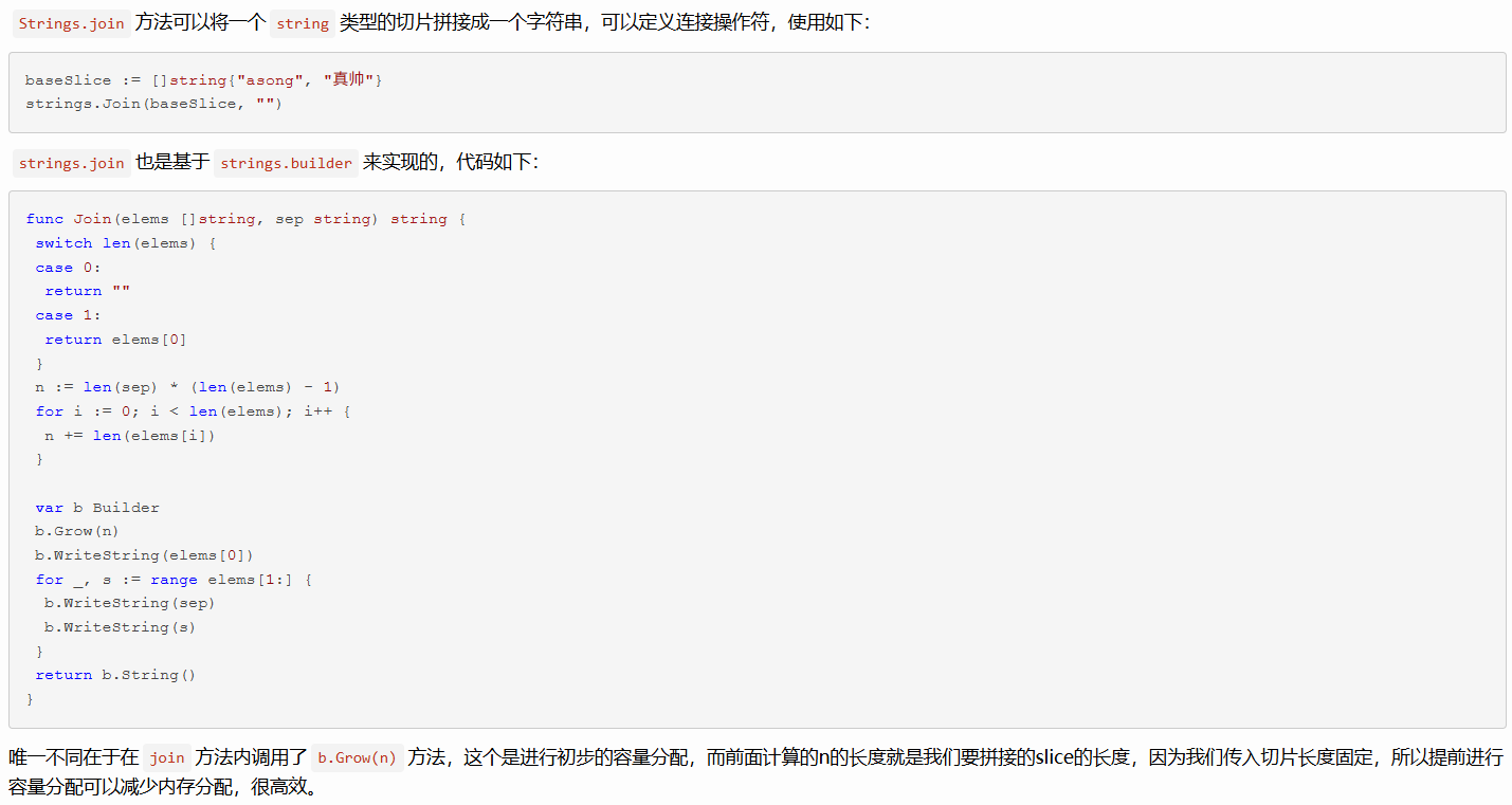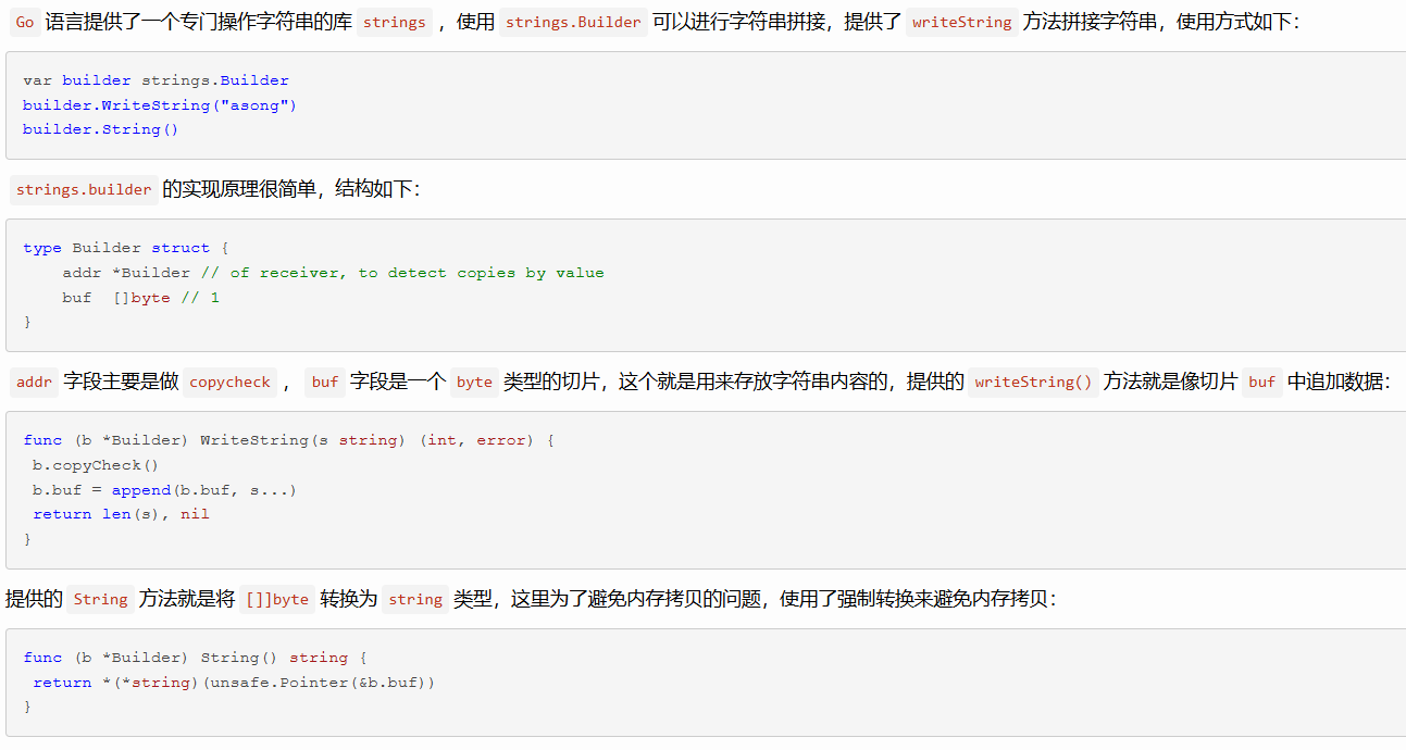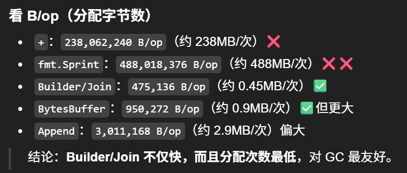 - strings.Builder(推荐:循环/大量拼接)