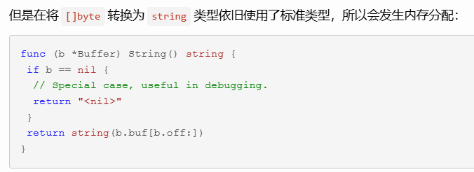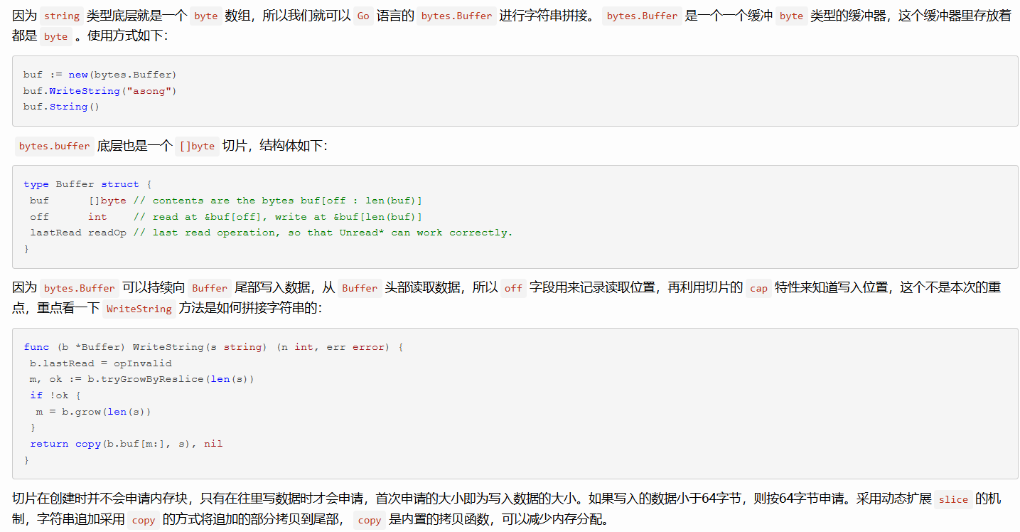 至于为什么拷贝次数少,是因为使用的第一个[]byte在make的时候先预估最后拼接的长度,后面做拼接则直接将需要拼接的内容写入就行,实在cap不够了才扩容然后发生拷贝。