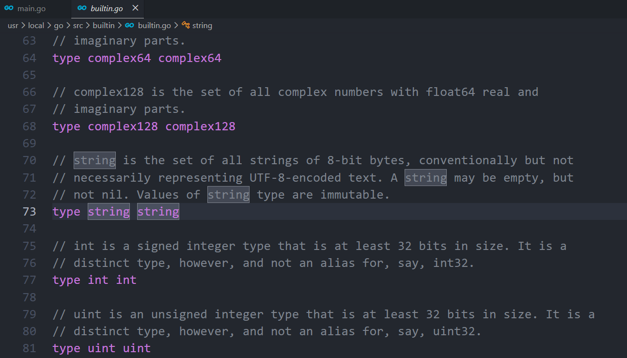 在IDE里面定义一个text的string变量,点击string跳转到其类型定义的地方,可从源代码看到对string的描述,源代码的位置在src/builtin/builtin.go,描述如下: