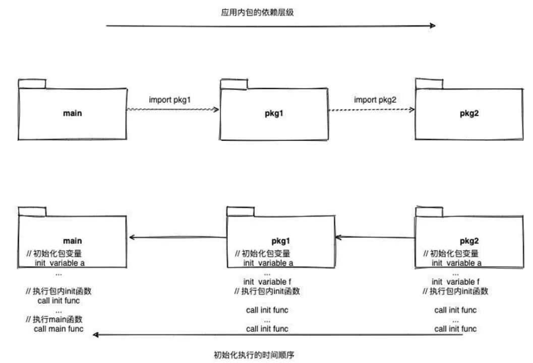 图的上半部分表示了main包导入了pkg1包,pkg1包又导入了pkg2包这样一个包之间的依赖关系。图的下半部分表示了,这个应用初始化工作的执行时间顺序是从被导入的最深层包开始进行初始化,层层递出最后到main包,每个包内部的初始化程序依然是先执行包变量初始化再进行init函数的执行。