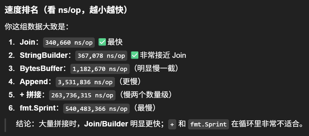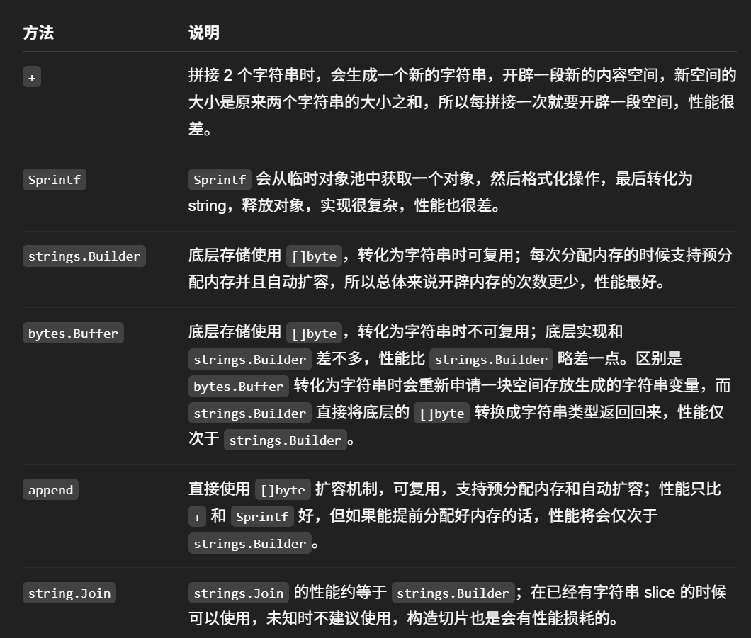 性能对比:strings.builder ≈ strings.join > bytes.buffer > append > "+" > fmt.sprintf
