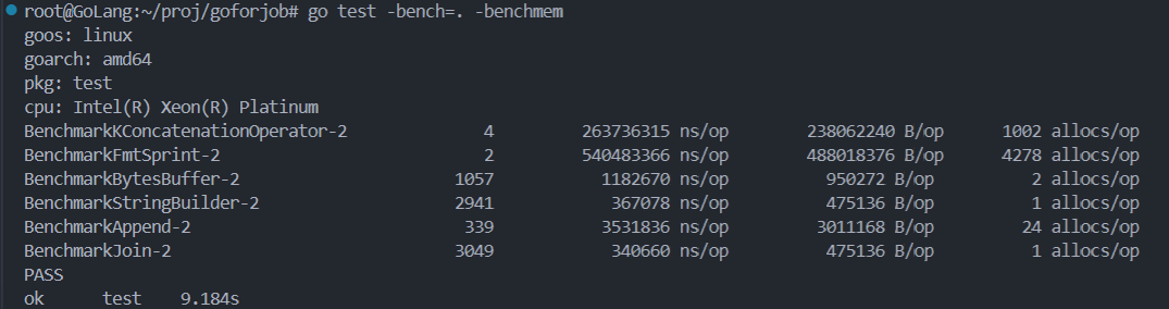 root@GoLang:~/proj/goforjob# go test -bench=. -benchmem
