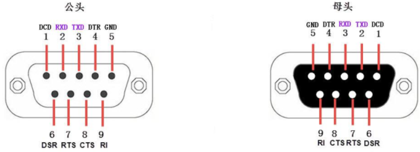 2.DB9公头定义中引脚2为RX,引脚3为TX;DB9母头定义中引脚2为TX,引脚3为RX。因此转接线需要反转以适配公头至母头的定义。DB9公头与母头详细的引脚定义如下图。