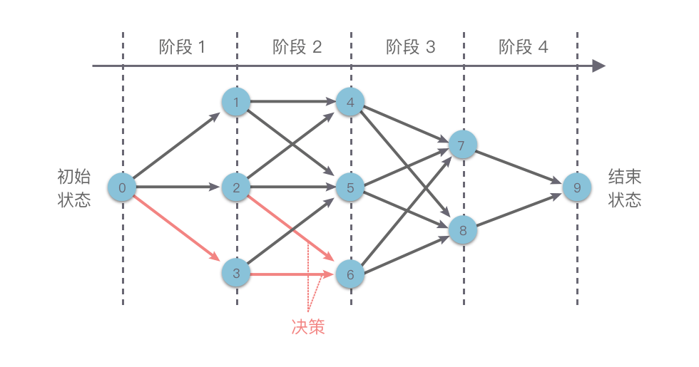 如下图所示,我们在使用动态规划方法解决某些最优化问题时,可以将解决问题的过程按照一定顺序(时间顺序、空间顺序或其他顺序)分解为若干个相互联系的「阶段」。然后按照顺序对每一个阶段做出「决策」,这个决策既决定了本阶段的效益,也决定了下一阶段的初始状态。依次做完每个阶段的决策之后,就得到了一个整个问题的决策序列。