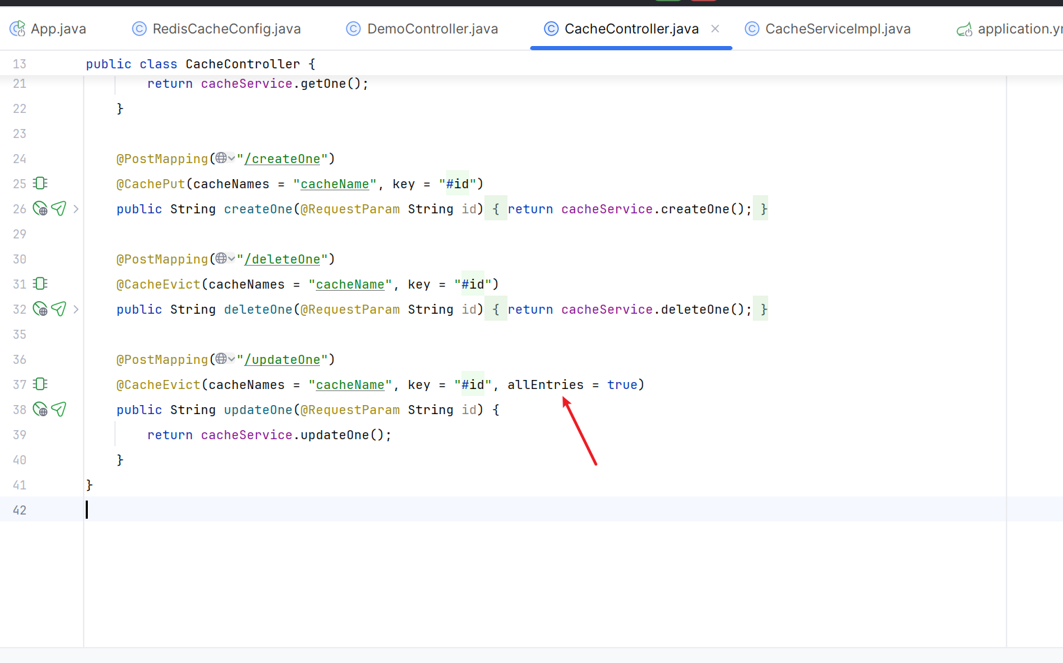 本来可以只让符合条件的,即 id=1 的缓存失效,上面都失效了,是因为我在更新方法的注解上额外加了一个属性。
