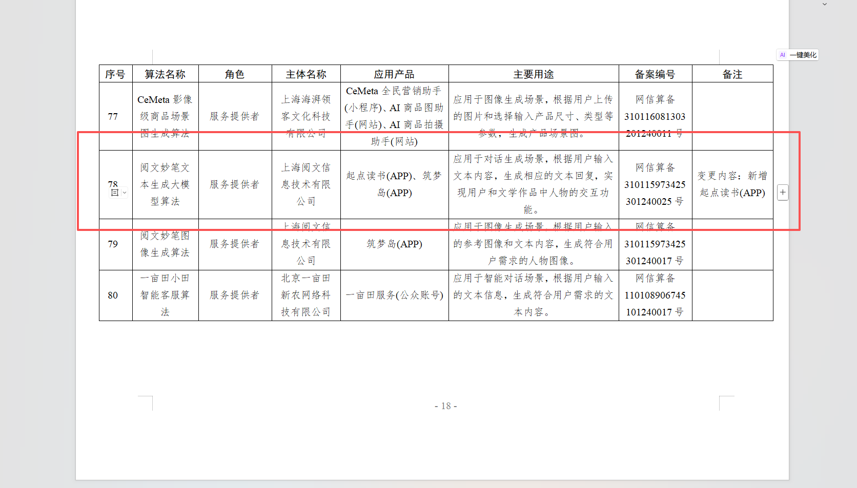 更关键的是:"阅文妙笔"相关算法出现在国家网信办公开的深度合成服务算法备案清单里(这不是营销口径,是监管维度的公开信息)。