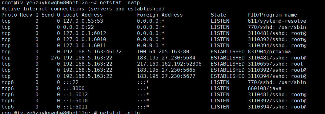 | PID/Program name | 对应连接的进程 ID 和程序名(谁占用了这个端口 / 建立了连接) | 比如611/systemd-resolve:PID 是 611,程序是systemd-resolve(负责 DNS 解析);770/sshd:PID 是 770,程序是sshd(SSH 服务) |