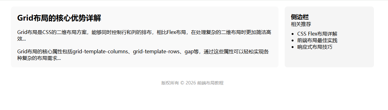 场景: PC 端博客、资讯、文档类页面的标准布局:左侧主体文章区占宽多,右侧侧边栏占宽少,底部 footer 通栏,适配所有屏幕尺寸,侧边栏和主体区自动等高,不用写height:100%,Grid 实现极其简洁。