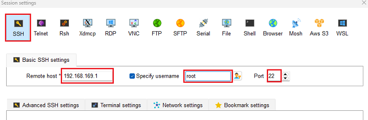 - 主控板的SSH服务正常开启后,确保主控板和PC电脑的网卡网络正常且都在同一个网段,在PC电脑运行SSH客户端(以MobaXterm工具为例),以主控端的登录账户名是root,登录密码是1234567890为例: