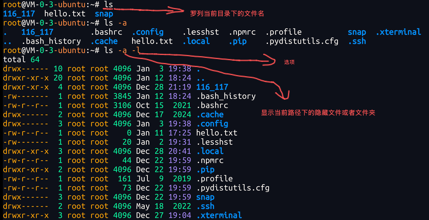 -a 列出⽬录下的所有⽂件,包括以 . 开头的隐含⽂件(等于文件内容+文件属性).