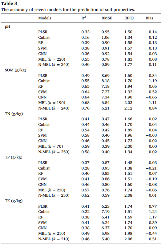 明确了不同模型对应的土壤特性预测优势:N-MBL 适合 SOM、TN、TP(尤其是高异质性的 TP),MBL 适合 pH、TK(无直接光谱响应的特性),为模型选择策略提供了具体场景参考。