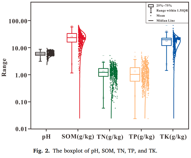用于建模的土壤 pH 值、SOM、TN、TK 和 TP 的描述性统计结果如表 2 所示。土壤 pH 值范围为 3.19-8.93,平均值为 6.14,表明该区域土壤呈微酸性。SOM、TN 和 TK 的平均值分别为 26.19 克 / 千克、1.33 克 / 千克和 18.74 克 / 千克。这三项特性的变异系数(CV)在 0.44-0.52 之间。相比之下,TP 的取值范围较广(0.02-6.96 克 / 千克),变异系数(CV)为 0.78,是五项特性中最高的,表明该区域土壤中的 TP 可能受外部因素影响,异质性较强。这五项土壤特性的偏度在 0.23-1.49 之间。