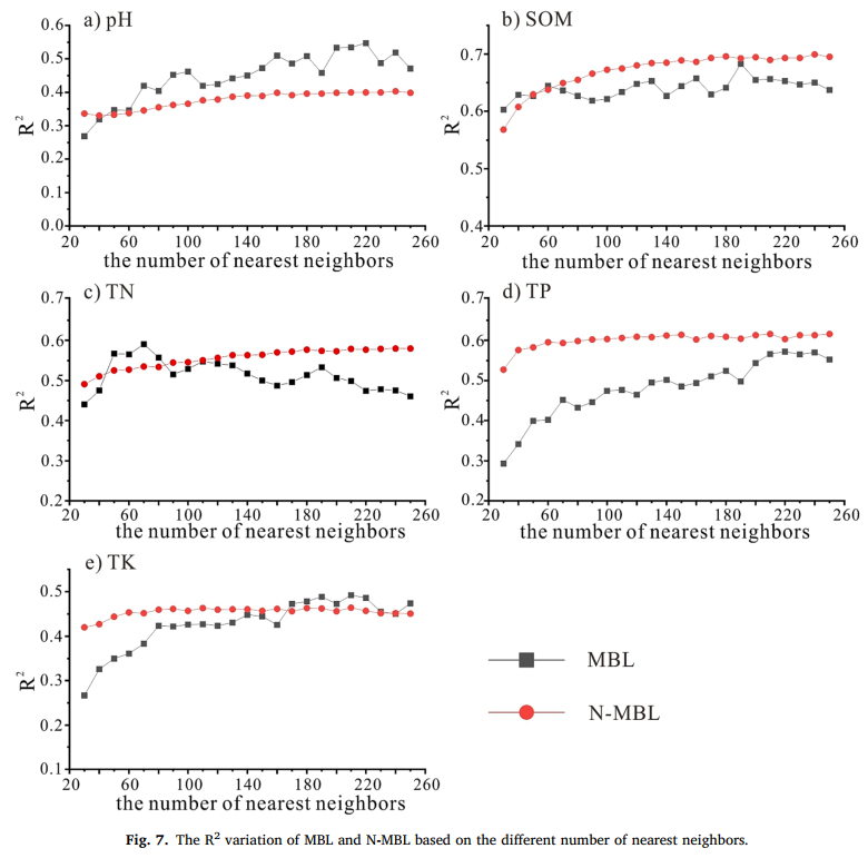 MBL 和 N-MBL 均为局部模型,其精度受参数 k 的影响,因此本节展示性能最佳的模型。首先,局部模型的性能优于机器学习模型。MBL 在 pH 值和 TK 预测中的精度优于 N-MBL,R2分别为 0.55 和 0.49。相反,N-MBL 在 SOM(R2为 0.70)和 TP(R2为 0.62)估算中的性能显著优于 MBL(参数 k 最优)。N-MBL(R2为 0.58)和 MBL(R2为 0.59)在 TN 预测中的精度相近。此外,MBL 也可采用高斯过程回归(GPR)进行拟合和预测,结果见补充材料(Supplementary material),表明 N-MBL 和基于 PLSR 的 MBL 的精度远高于基于 GPR 的 MBL(Table S1)。