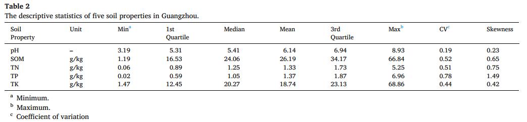表 2 广州地区五项土壤特性的描述性统计(Table 2 The descriptive statistics of five soil properties in Guangzhou.)
