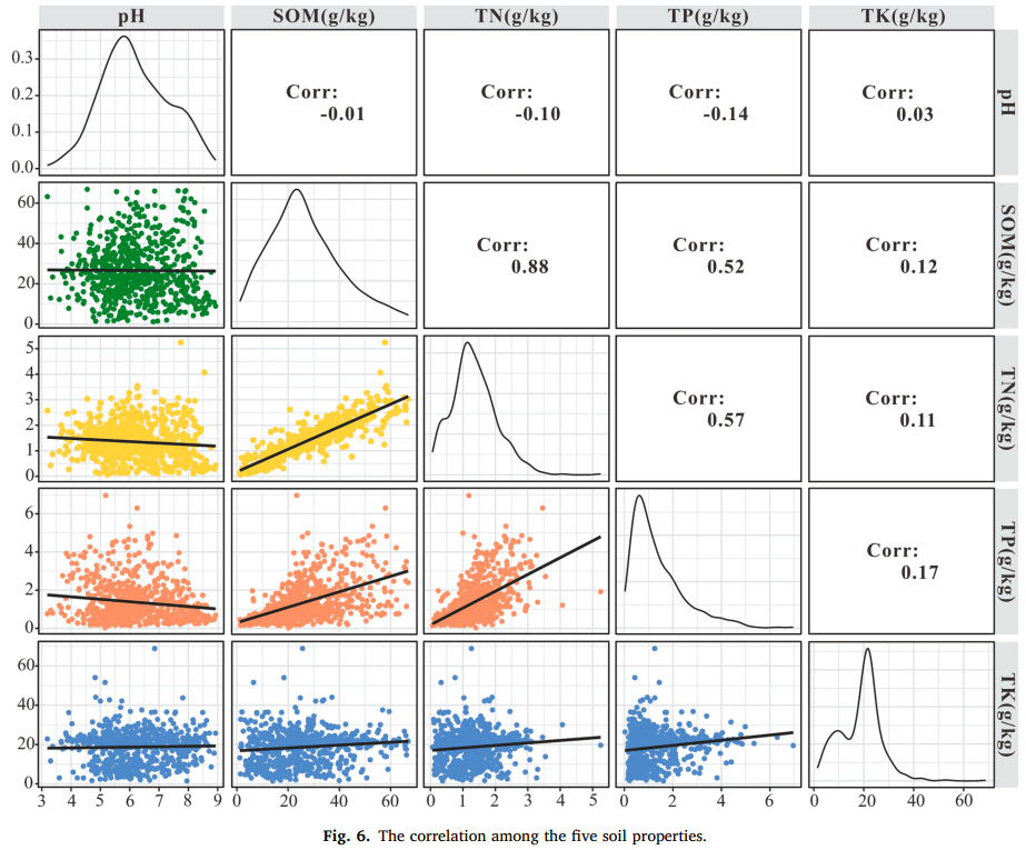 五项土壤特性(pH 值、SOM、TN、TP 和 TK)之间的相关性如 Fig. 6 所示。pH 值与 TK 之间的相关性极小,与其他四项土壤特性的相关系数均低于 0.17。另一方面,SOM、TN 和 TP 之间存在显著的正相关关系。SOM 与 TN 的相关系数为 0.88,SOM 与 TP 的相关系数为 0.52,TN 与 TP 的相关系数为 0.57。
