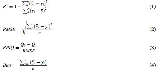 其中,n 为样本数量,yi和yi分别为第 i 个样本的实测值和预测值,yˉ为实测值的平均值。Q3和Q1分别为第三四分位数和第一四分位数,两者之差为四分位距。通常,R2和 RPIQ 越高,RMSE 和偏差越低,模型性能越好。这些指标通过 R 4.2.1 软件计算(R Core Team, 2022)。