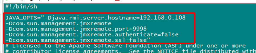 | JAVA_OPTS="-Djava.rmi.server.hostname=192.168.0.108 -Dcom.sun.management.jmxremote -Dcom.sun.management.jmxremote.port=9999 -Dcom.sun.management.jmxremote.authenticate=false -Dcom.sun.management.jmxremote.ssl=false" |