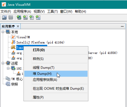 通过右键菜单中的"堆Dump"选项,可以立即获得当前应用程序的内存快照,如图6.43
