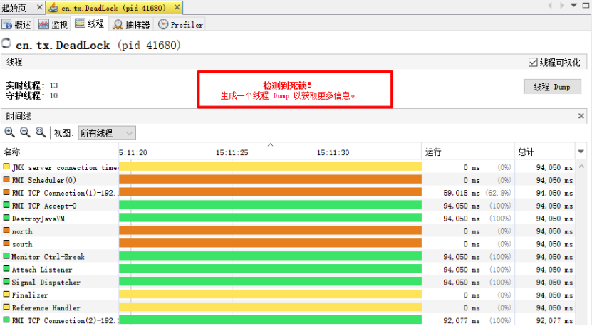 如果Visual VM在当前程序中找到死锁,则会以十分显眼的方式在线程页面给予提示,如