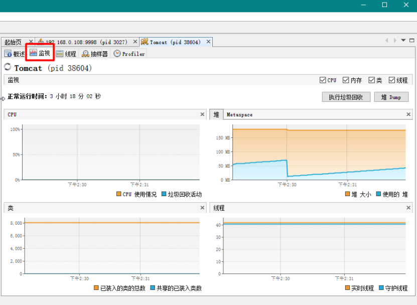 单击Tab页面上的监视页面,即可监控应用程序CPU、堆、永久区、类加载和线程数的总体情况。通过页面上的"执行垃圾回收"和"堆Dump"按钮还可以手工执行Full GC和生成堆快照,如图所示。