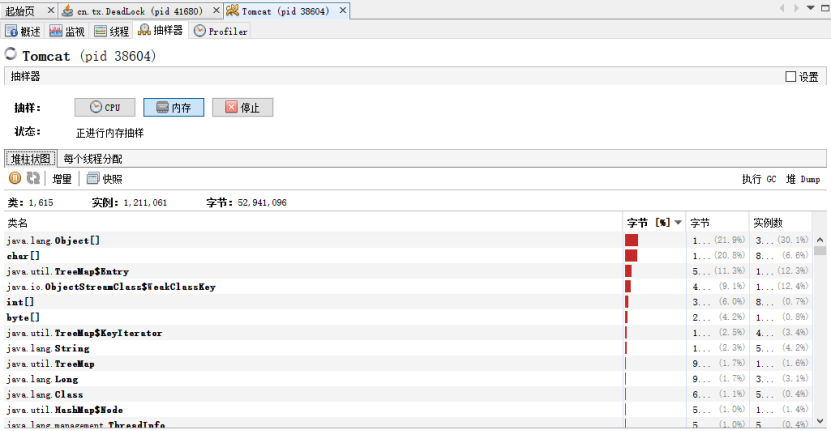 (2)在类页面中,以类为索引,显示了每个类的实例数占用空间。