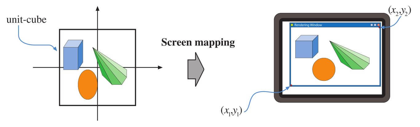 图2.7. 投影变换后的图元位于单位立方体中,屏幕映射程序负责在屏幕上找到坐标。