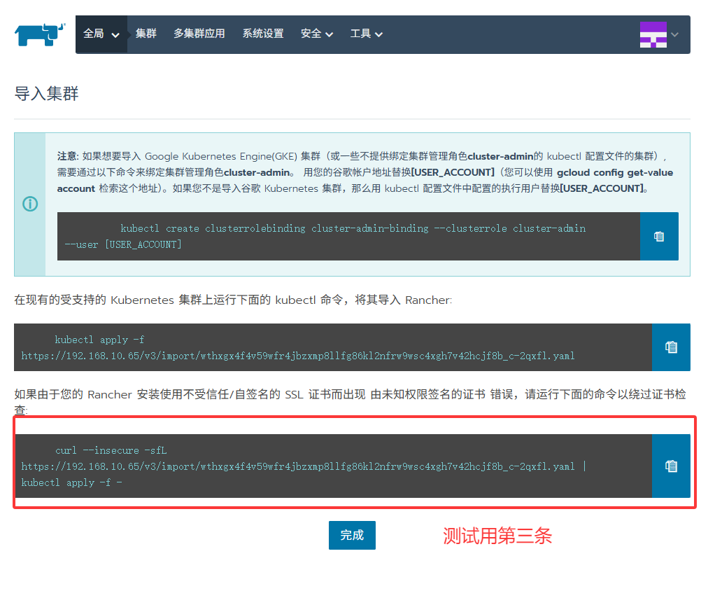 选择复制第三条命令绕过证书检查导入 k8s 集群