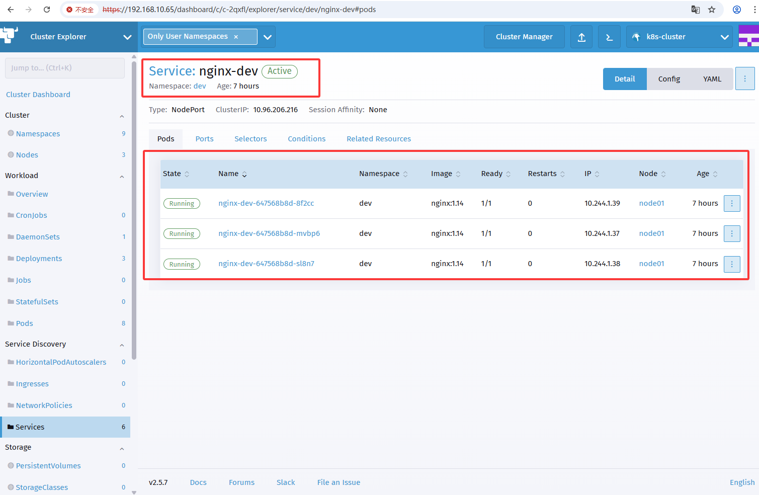 点击【nginx-dev】查看 service 是否已关联上 Pod