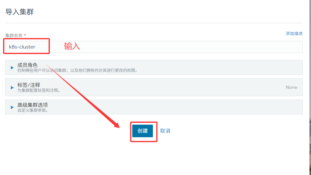 【集群名称】设置为 k8s-cluster,点击【创建】