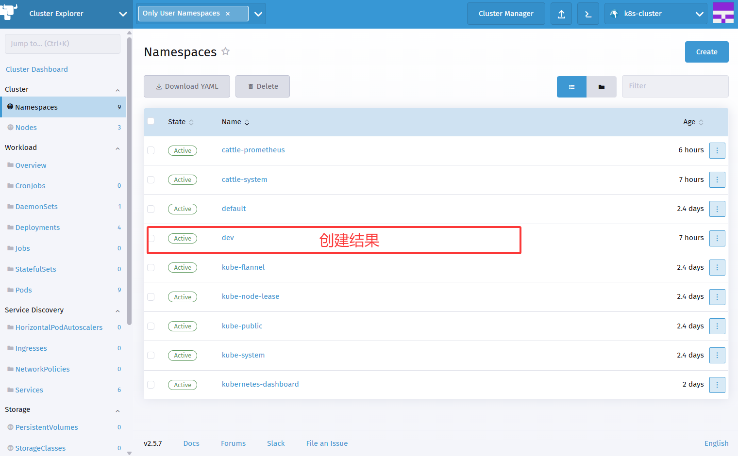 点击左侧菜单【Namespaces】,再点击右侧【Create】
