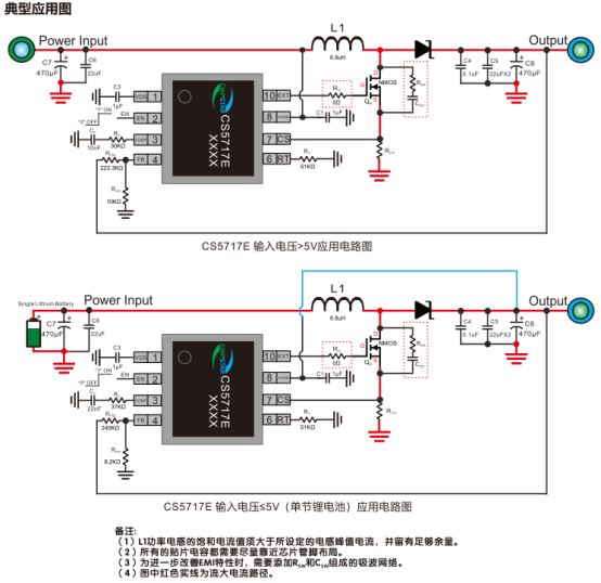 相比FP5207,CS5717E输入电压范围更宽(36V最高输入),反馈电压精度更高(±1%),适用场景更灵活。外围配置可直接复用FP5207方案,电感、电容、分压电阻等无需重新选型,替换成本极低,是FP5207的高性价比替代选择。