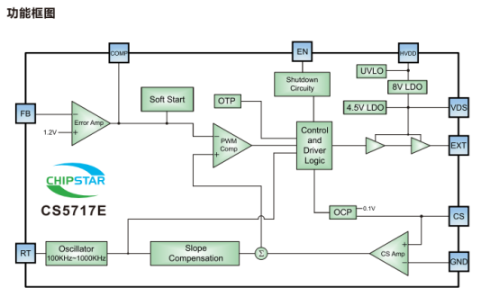 功能与保护机制和FP5207完全对齐:采用电流模式PWM控制,轻载自动切换至跳周模式(PSM)提升效率,与FP5207工作逻辑一致;内置软启动功能,避免启动电流尖峰;输入欠压保护(2.6V阈值,0.1V滞回)、开关管过流保护(通过CS引脚外接电阻设定)、150℃过温保护(30℃滞回),保护体系完整覆盖FP5207的核心防护需求;需驱动外部NMOS,EXT引脚提供栅极驱动信号,驱动方式与FP5207相同,外部MOS选型可复用原方案。