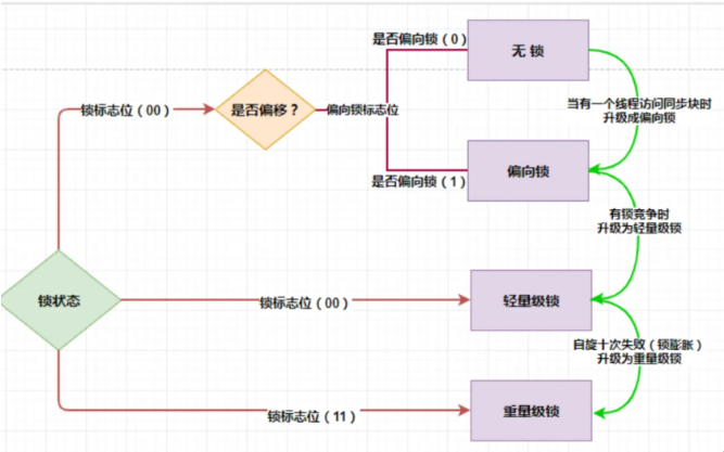 锁膨胀:synchronized 从无锁升级到偏向锁,再到轻量级锁,最后到重量级锁的过程,它叫做锁膨胀也叫做锁升级。JDK 1.6 之前,synchronized 是重量级锁,也就是说 synchronized 在释放和获取锁时都会从用户态转换成内核态,而转换的效率是比较低的。但有了锁膨胀机制之后,synchronized 的状态就多了无锁、偏向锁以及轻量级锁了,这时候在进行并发操作时,大部分的场景都不需要用户态到内核态的转换了,这样就大幅的提升了 synchronized 的性能。