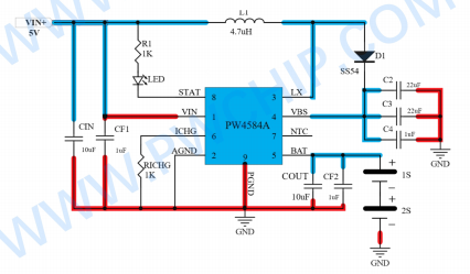 PW4584A同样是一款面向两节锂电池的升压充电芯片,但采用异步升压架构(即外部需搭配肖特基二极管)。其输入电压范围更宽(3.6V-6V),开关频率为500kHz,典型转换效率约为90%。 - 主要特点